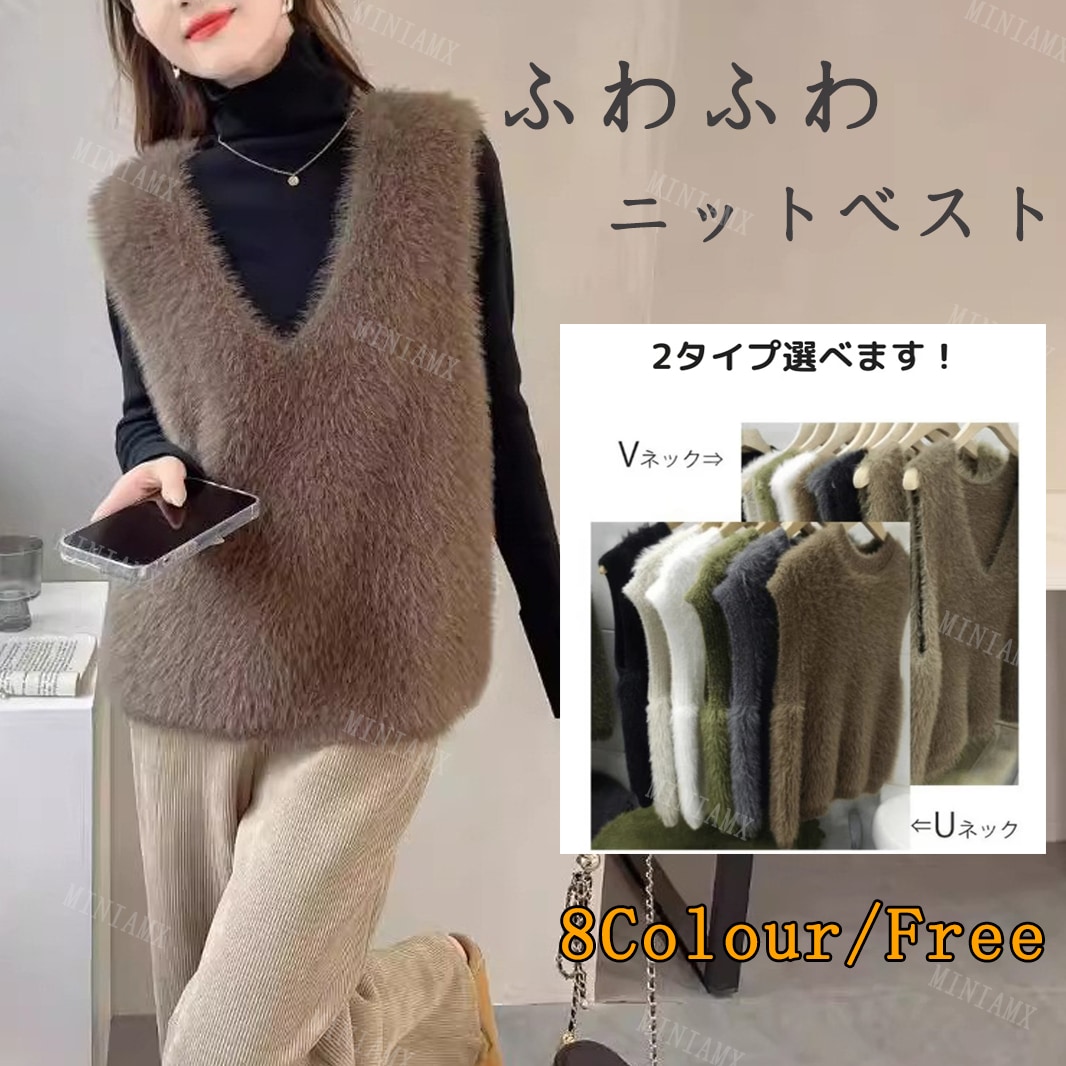 ニットベスト ふわふわ エコファー フェイクファー 可愛い レディース フリーサイズ Uネック Vネック レイヤード 毛足長め プルオーバー セーター ノースリーブ