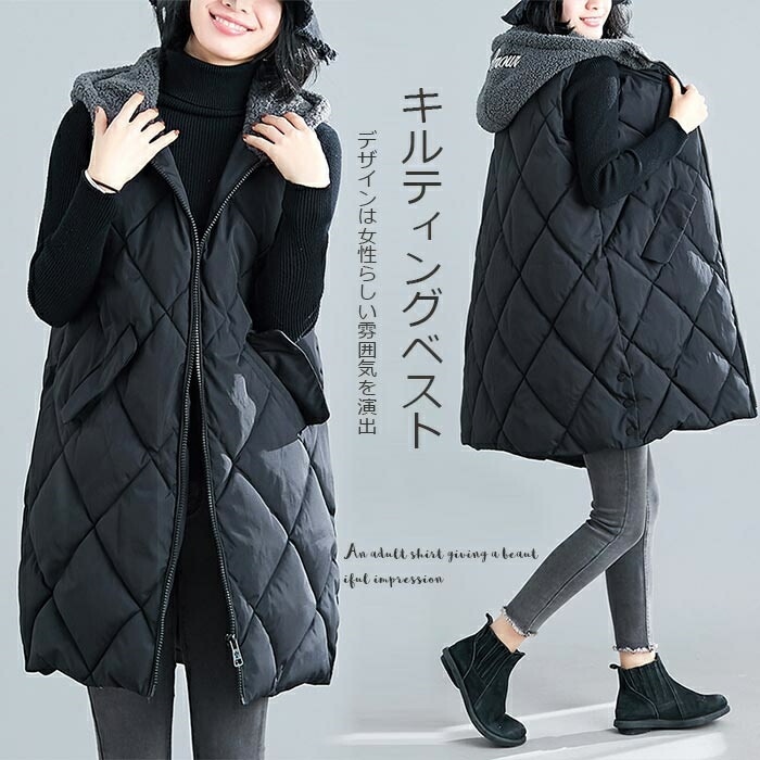 キルティングベスト レディース ベスト ジャケット 中綿 アウター 冬 中綿コート ロング コート 中綿ベスト ロングベスト 羽織もの 秋冬 フード付き ノースリーブ レイヤード おしゃれ 体型カバー