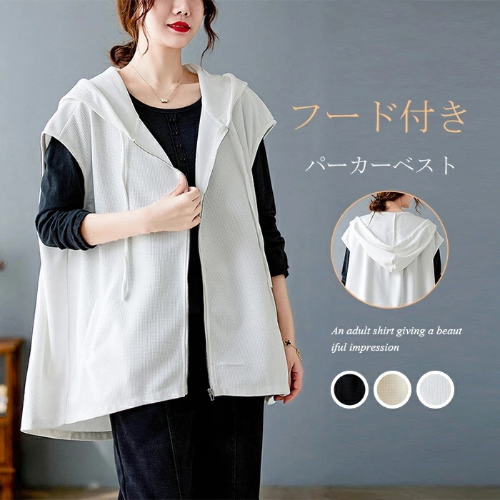 ベスト ジレ レディース トップス ノースリーブ アウター レイヤード パーカー 春 秋 前開き トップス フード付き ジップアップ パーカーベスト フード付きパーカー ゆったり カットソー 重ね着