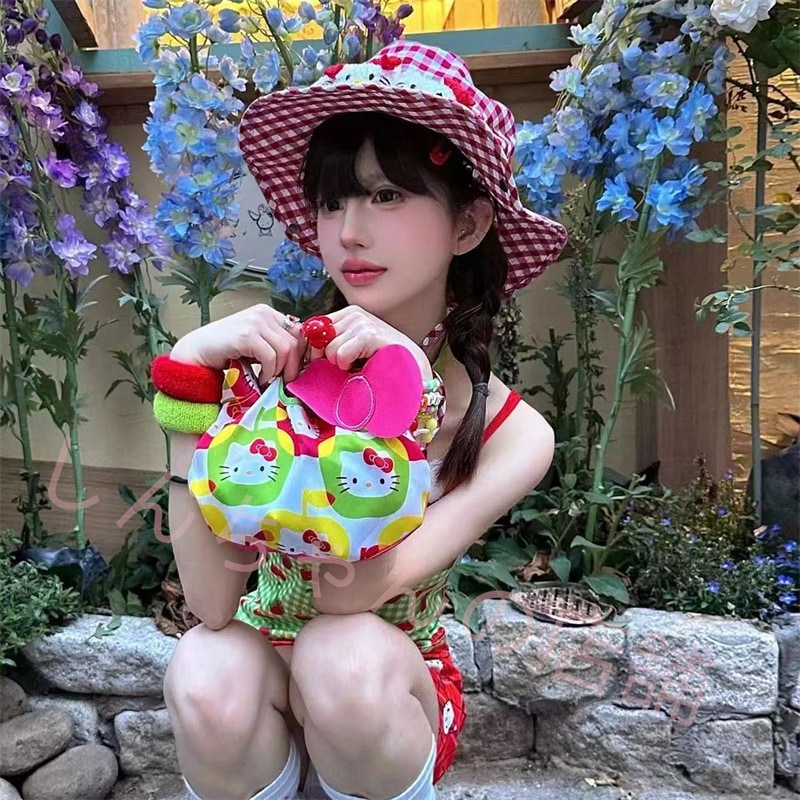 新しいかわいい格子キティポットハットビーチピクニックこんな帽子y 2 kスウィートドーパミン漁師帽子ストラップ ハット