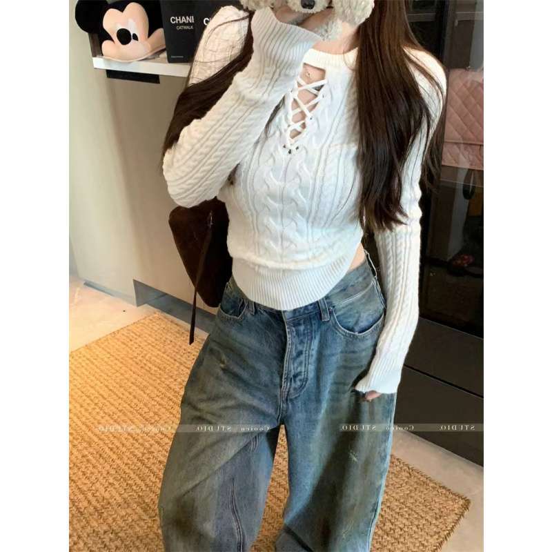 人気なリブニット 蝶結びストラップレスホワイト長袖ニット女性冬のトップス ニット