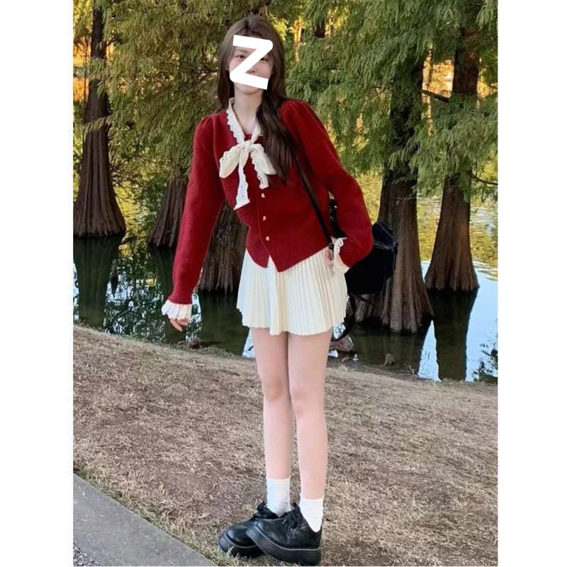 人気なリブニット 蝶結びの新年赤いセーターカーディガン女性冬2025新しいニットトップ ニット