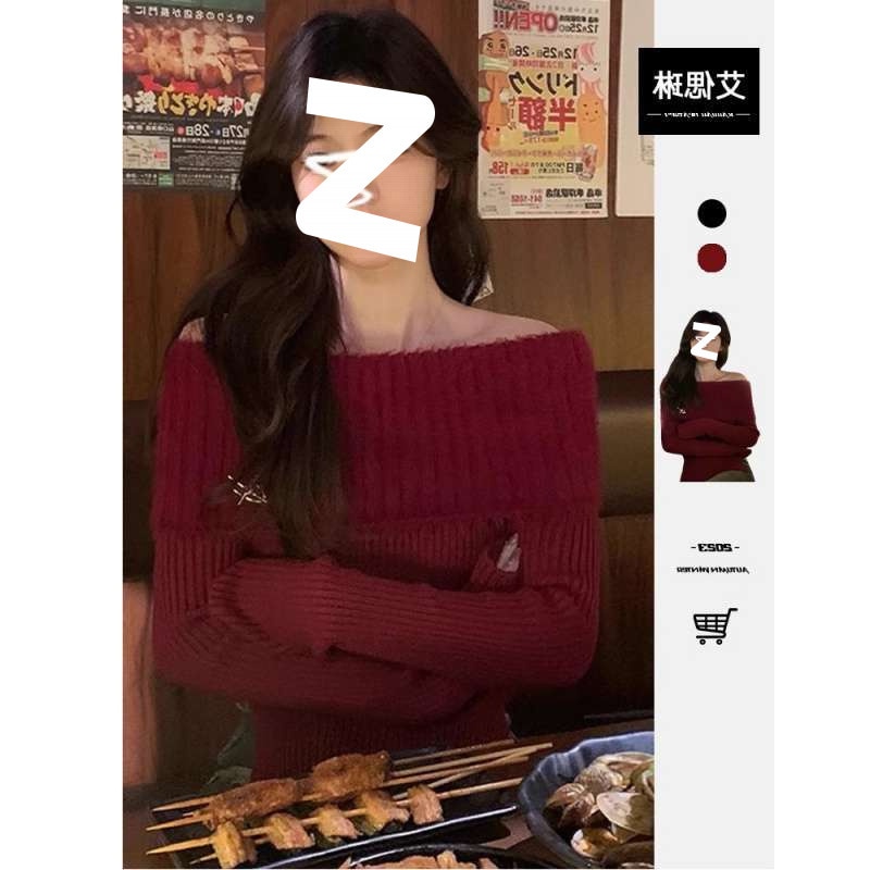 人気なリブニット 赤いジャンパー冬2025新しい怠惰なスタイルワンショルダーニットトップス ニット