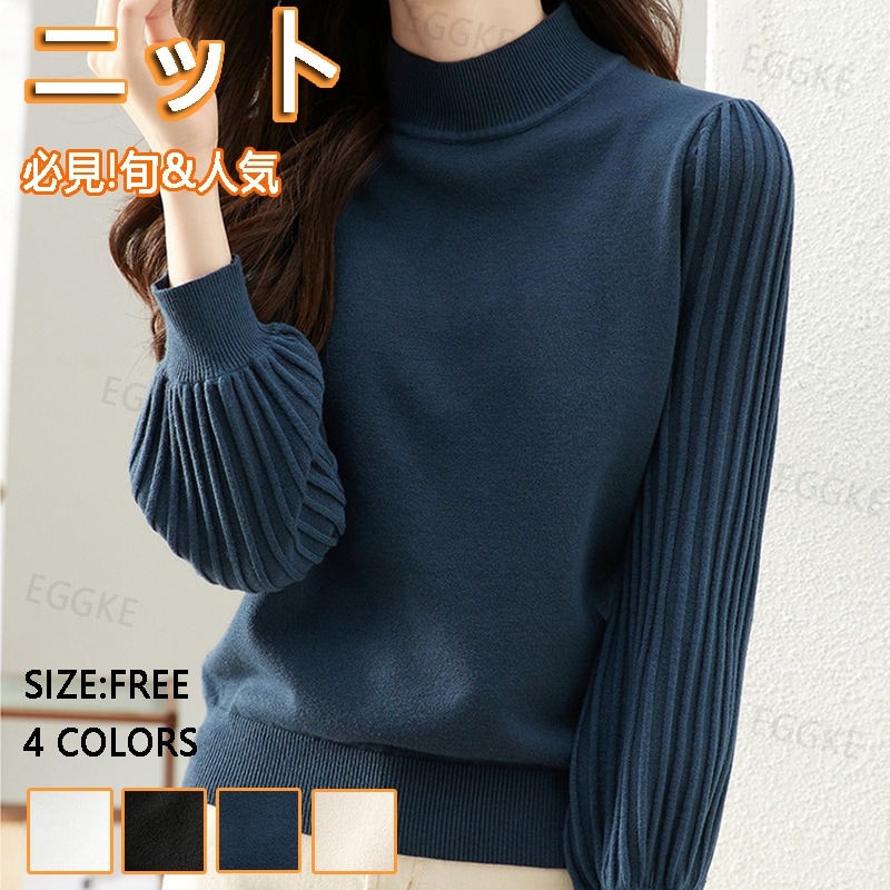 トップス リブ ニットモックネック プリーツスリーブ ぽわん袖 ハイネック 二の腕カバー 長袖 プルオーバー レディースファッション 20代 30代 40代 50代 60代