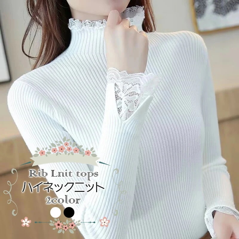 リブニット トップス レディース ハイネック ニットセーター レースフリル襟 長袖 ニットソー スリムフィット ニットウェアリブニット 春秋冬 きれいめニット無地 リブニットインナー