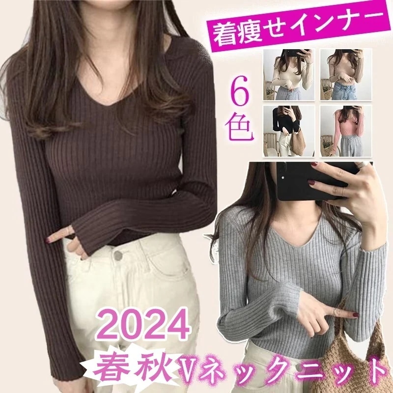 Tシャツカットソー Vネック 2024新作 韓国ファッション 春秋 新作 長袖 着痩せ ニット アンダーウェア セーター インナー トップスレディースカシミヤタッチ ベーシックニット Tシャツカット