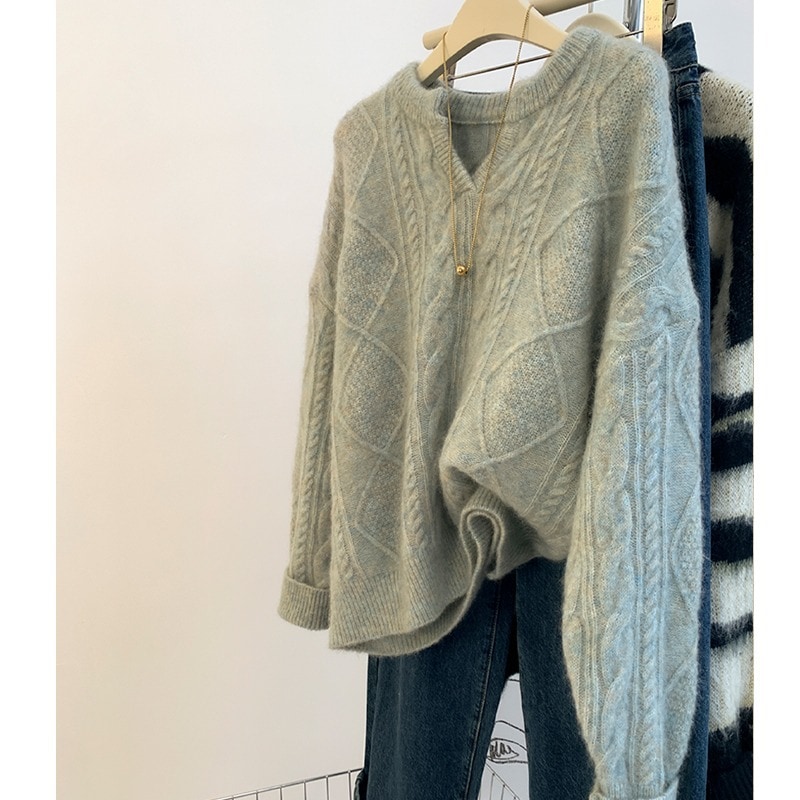 高級グレーvネックマーブルアライグマのダウンセーター女性秋冬冬厚くだるくてモチモチしたウールニット ニット