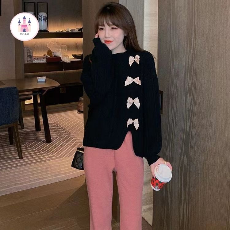 甘めリボン開叉セーター女2024秋冬新作コーデュロイ可愛いショート丈ゆったりニットトップス ニット