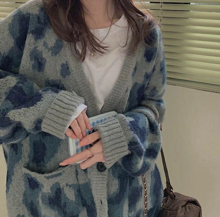 カーディガン ニット レディース トップス 重ね着 ルーズ Vネック ビッグサイズ 長袖 おしゃれ ヒョウ柄 グレー 青 ブルー アニマル レオパード柄 カジュアル 可愛い オーバーサイズ 大きめ こ
