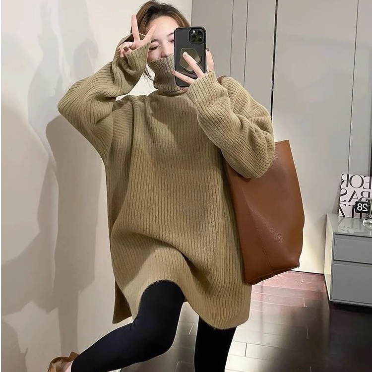 秋冬新作女性用大きいサイズセーター2024フレンチレイジースタイルソフトでワックス状のアウター無地ルーズミドル丈セーター ニット