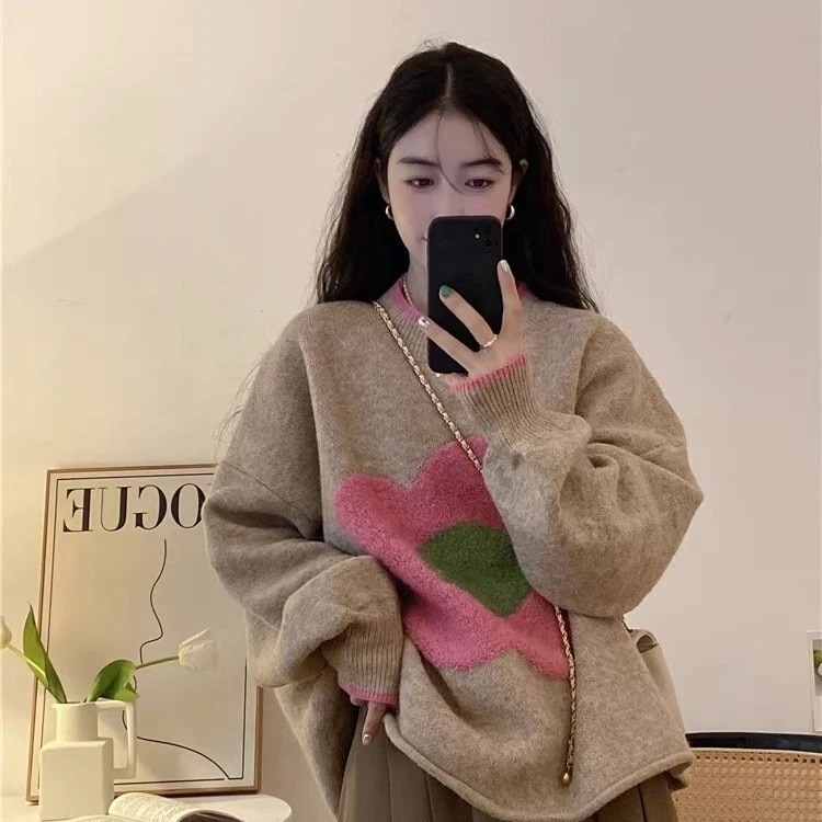 カシミャタッチ かわいいデザイン感小衆グリーンの花ニットセーター秋冬新作ぶつかり色ゆったり丸首長袖トップス メガ割 ニットカーディガン ベーシックニット リブニット