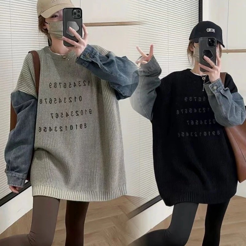 人気なリブニット 秋冬新作 デニム色切り替え ニットセーター ゆったり 怠惰な風 セーター レディース 流行り 百掛け 長袖ニットトップス 大きいサイズ 体型カバーベーシックニット インナー
