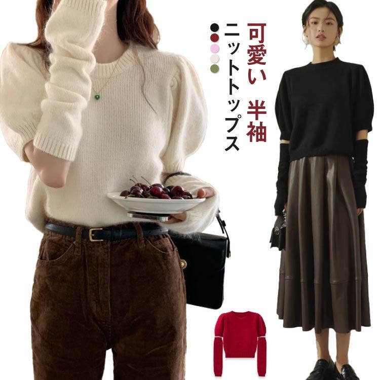 人気商品超目玉 ニット セーター トップス レディース 半袖 半袖ニット 秋 冬 アームカバー付き クルーネック もこもこ ふわふわ アームウォーマー付き