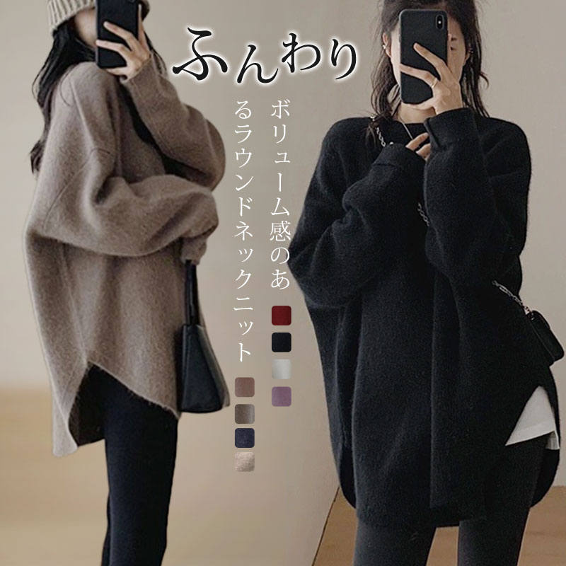 新品入荷 ニット セーター レディース 微起毛 秋冬 長袖 暖かい ラウンドヘム ラウンドネック モヘア シャギー オーバーサイズ ゆったり トップス チュニック丈 ドロップショルダー こなれ感