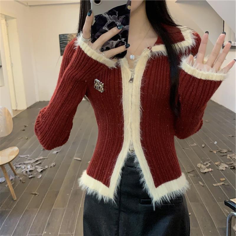 ジャンパー女性秋と冬の新しいクリスマスの摩耗赤ダブルジップニットカーディガン女性スリムジャケットショートトップ女性 ニット