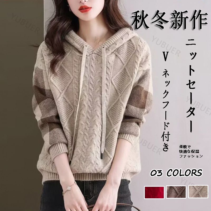 人気 ニット セーター 秋冬ファッション 厚手 保温 レディース パーカー Vネックフード付き アウター ゆったり 長袖 裹起毛トップス 百掛け ニットカーディガン プルオーバー