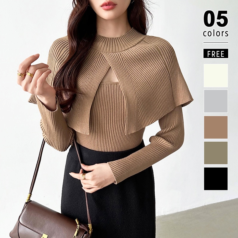 ケープドッキングニット ケープニット リブニット ドッキング ニット ケープ トップス 長袖 レディース ポンチョ クルーネック プルオーバー オフィス セーター