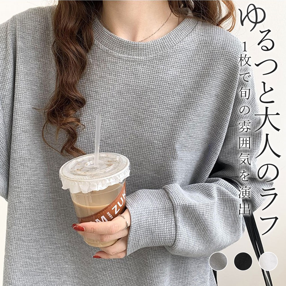 2枚同時買うと100円OFF ワッフル生地トップス長袖 メロウラウンドネック 長袖 メロウ フリル ボーダー ニット トップス カットソー ツートーン メロー おしゃれ 無地 かわいい シン