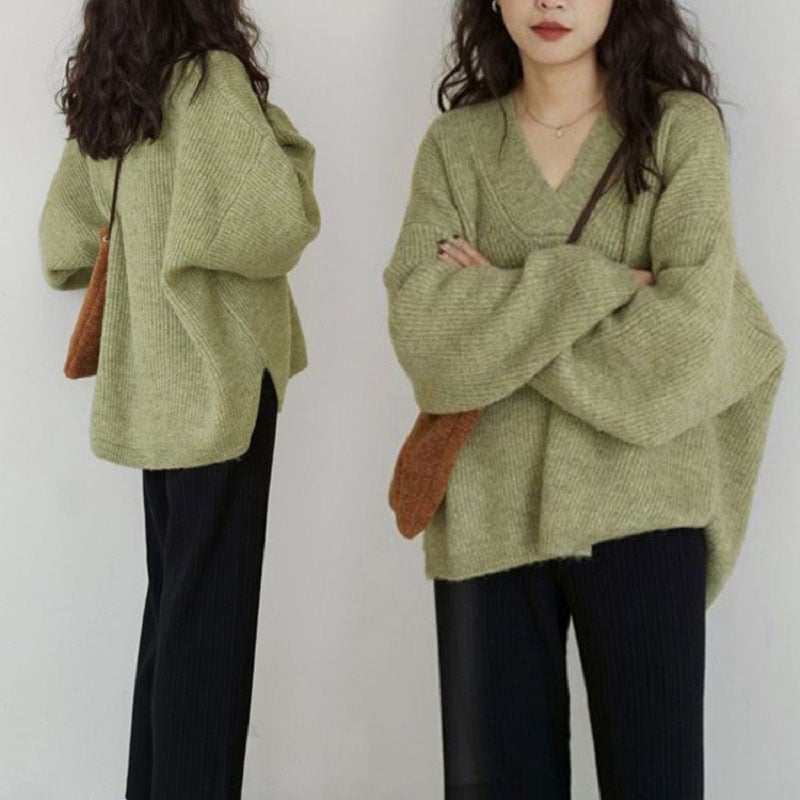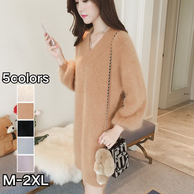 ベーシックニット人気なリブニットゆったりスウェット韓国ファッション カシミヤタッチ ニット Vネック トップス セミロング丈 トップス ニット ベーシックニット トップス ベーシックニット