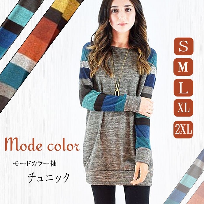モードカラーチュニック モードカラー 長袖 ボーダー柄袖 薄手 ブルー ニット