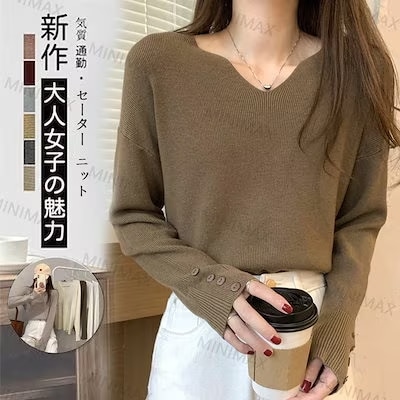 レディース ニットセーター 韓国ファッション 流行りVネックベーシックニット ゆったりスウェットトップス長袖ニットトップス 着痩せセーター ニット