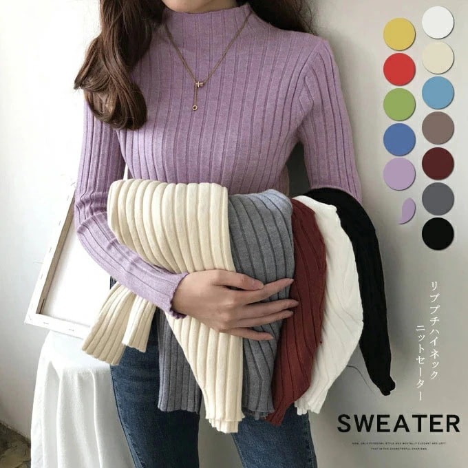 レディース ニットセーター リブニット ストレッチ プチハイネック 長袖 トップス リブ ハイネック 通勤 伸縮性 セーター ニット