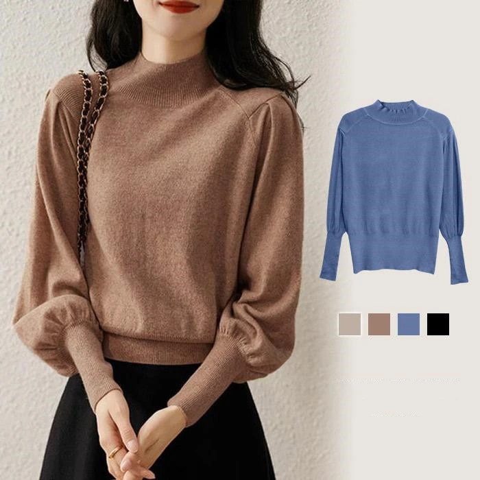 ニットトップス レディース 春 夏 春夏 黒 長袖 セーター ニット パフスリーブ ハイネック 無地 ブラック ベージュ ブラウン ブルー 20代 30代 40代