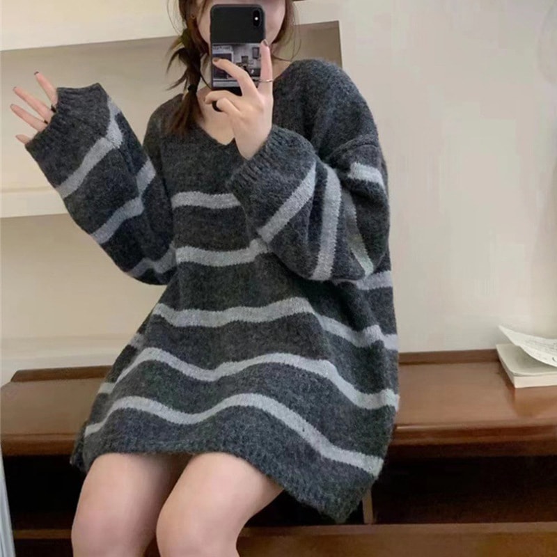 怠惰な風がゆったりとした縞模様のセーター女性秋冬レトロな新気質の中で中にはニットの上着がある ニット