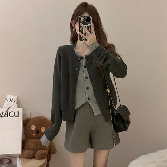 2024新型感セーター女性グレーの中には早秋の偽の丸首ニットカーディガンが2枚入っている ニット