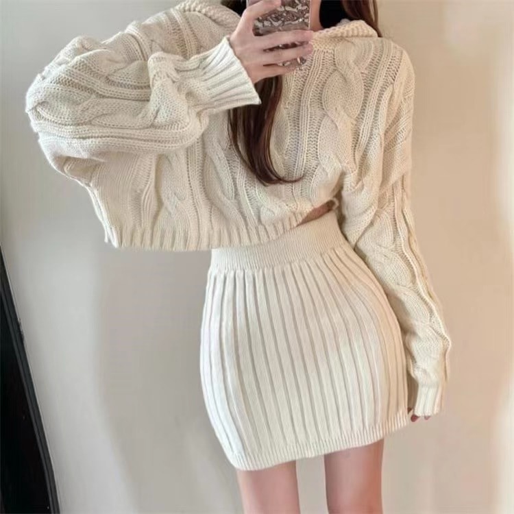 秋冬の新型レトロ洋気フード付きニット麻花セーター高腰弾力包尻半身スカートセット ニット