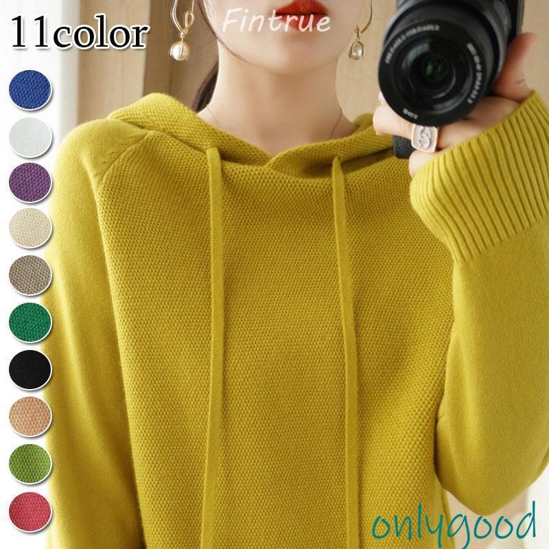 ニット セーター レディース ニットパーカー シンプル 秋 フード付き セーター プルオーバー ニットルーズ V ネック 長袖 ゆったり 無地 秋ファッション