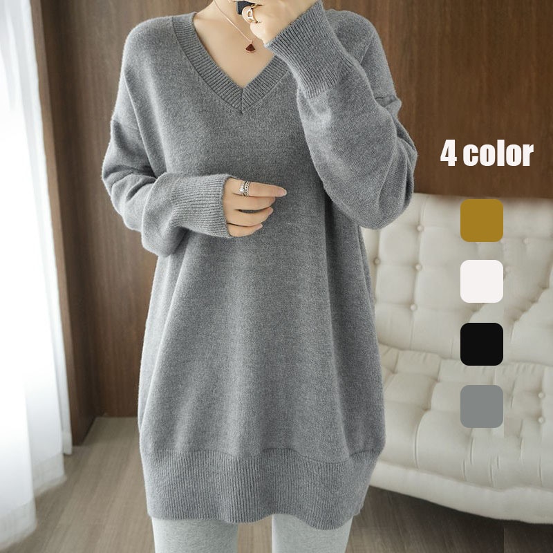 ベーシックニットゆったりスウェット韓国ファッション カシミヤタッチ ニット Vネック トップス セミロング丈 トップス ニット ベーシックニット トップス ベーシックニット