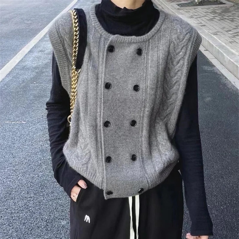 ベーシックニット 韓国版ダブルブレストニットベスト女春冬新作丸首カジュアルベスト女ベスト ニット