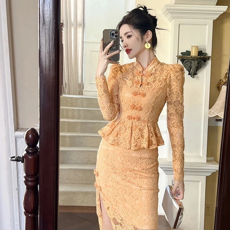 2024秋冬ガールズ改良チャイナドレスダイヤモンドフリルウエストツーピースヒップカバードレス女性用 11211 ドレス