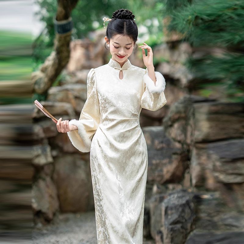 パーティードレス ピンクの変形チョンサンレトロ秋冬2025新作長袖ドレス ドレス