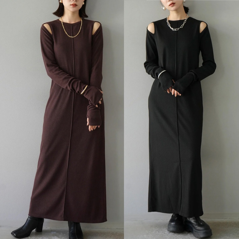 2色 新作 春 韓国 ワンピース 長袖ワンピース 高級感オフショルダーネック 弾力 スリット パーティー ドレス ロングワンピース フレアスリーブ 気質 着やせ おしゃれ ワンピース レディース