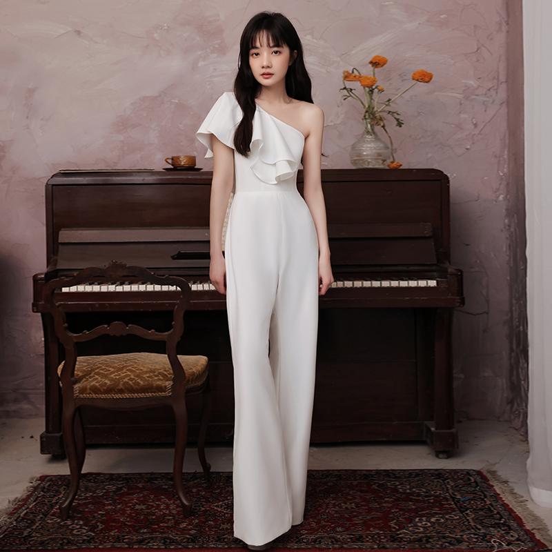 パンツドレス ロングドレス 演奏会 発表会 カクテルドレス イブニングドレス 大人 パーティードレス ワンショルダー ホワイト 前撮り おしゃれ ファッション