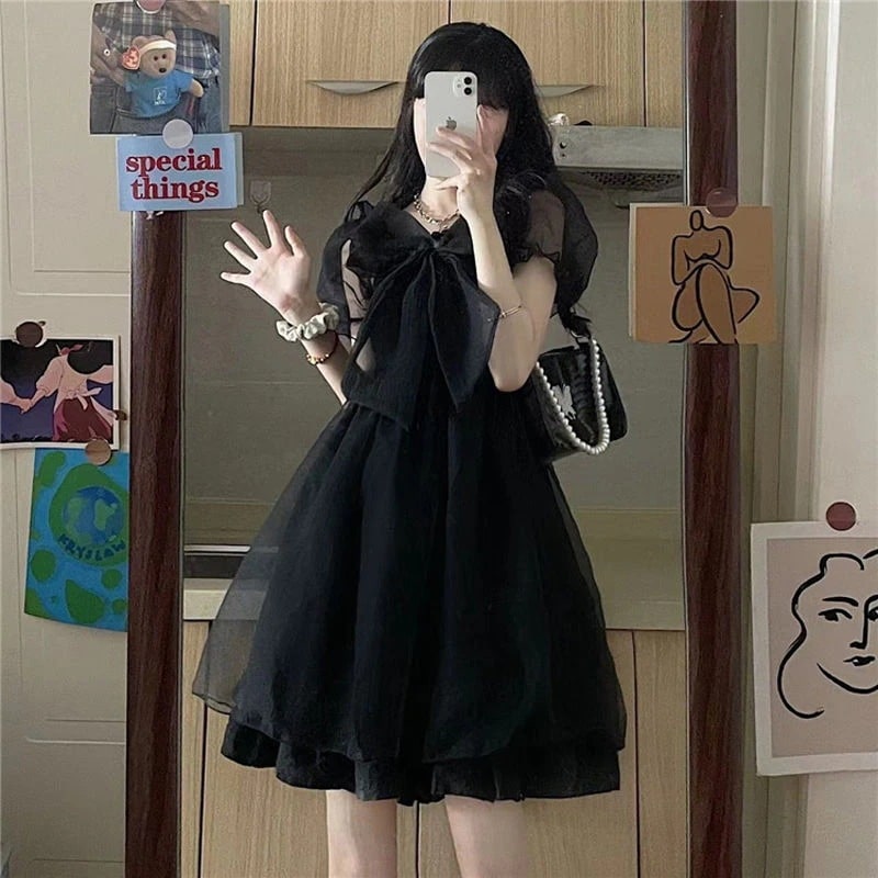 新入荷ins風ファッションロリータワンピース春夏 新型リボンネット糸半袖ポンポンa字スカート女コスプレ ドレス