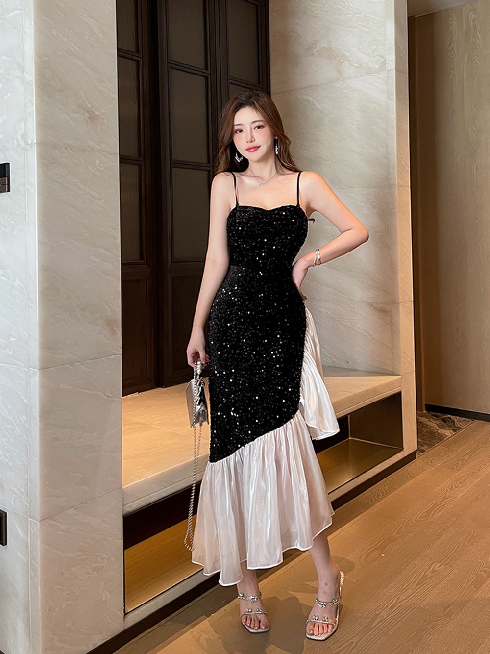 フレンチエレガントレディのスパンコールドレススリムフィットお尻カバーブサスペンダードレス秋 ドレス