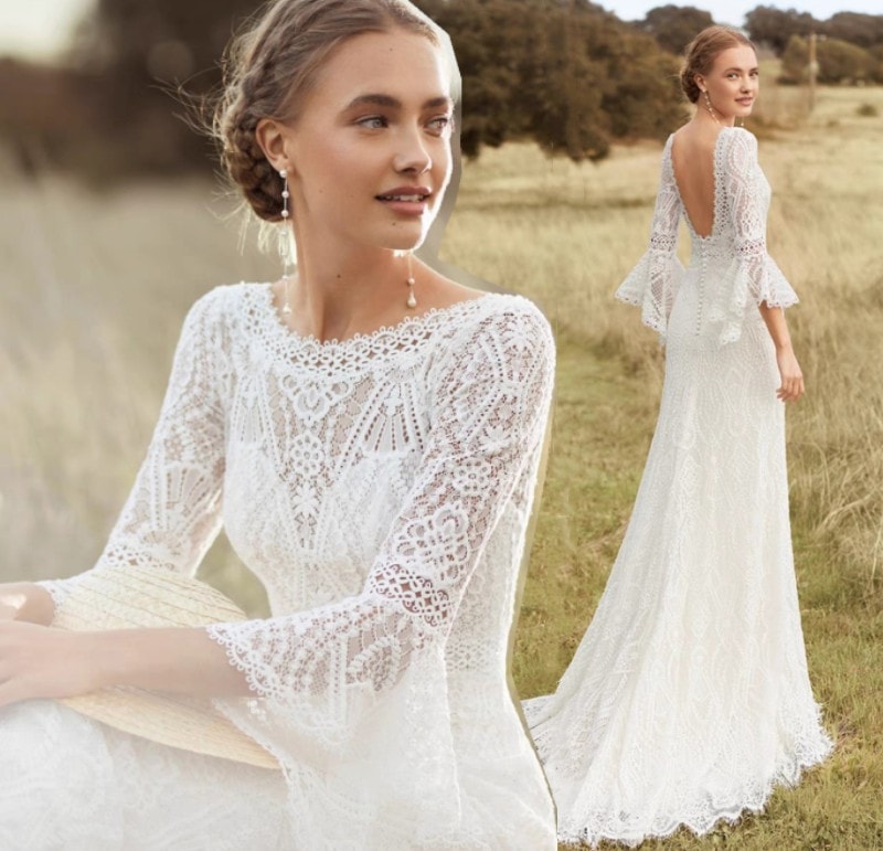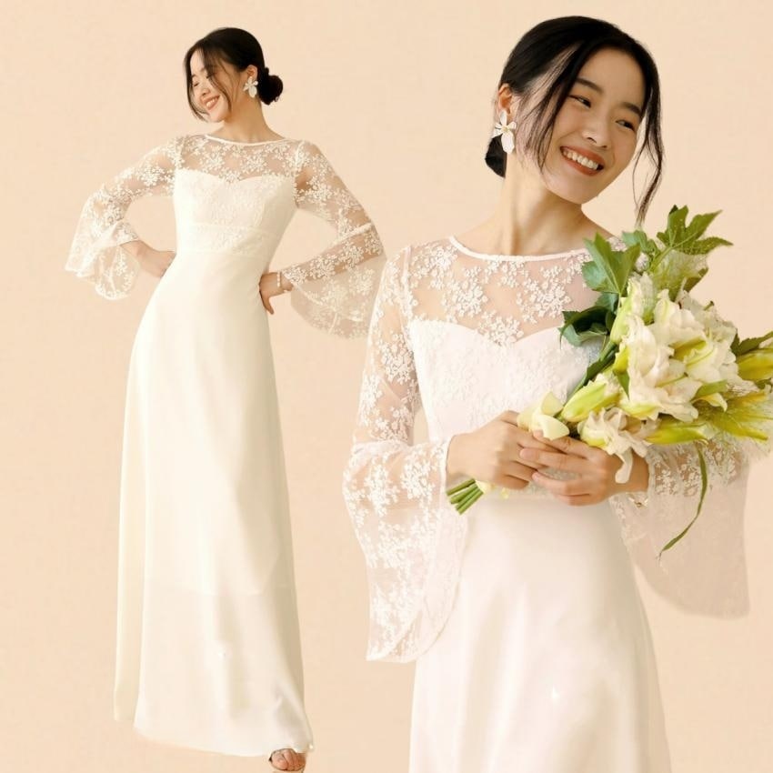 ウェディングドレス 袖あり スレンダーライン 白 花柄 総レース シースルー ワンピース 結婚式 二次会 披露宴 後撮り 二次会ドレス 花嫁ドレス ウエディング