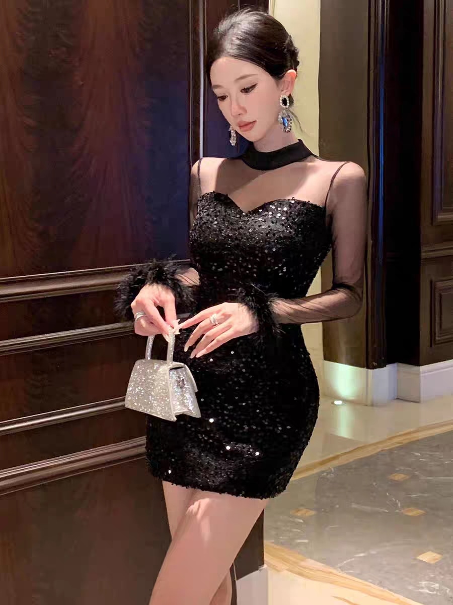 S L1色韓国メッシュパッチワークスパンコールセクシーヒップ包みワンピース ドレス