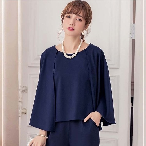 S_S.IL パンツドレス ガウチョパンツスーツ 七分袖 ケープ マント 無地 上下セット ツーピース パーティー 二次会 結婚式 披露宴 ネイビー 黒 ブラウン S M L 2L 3L