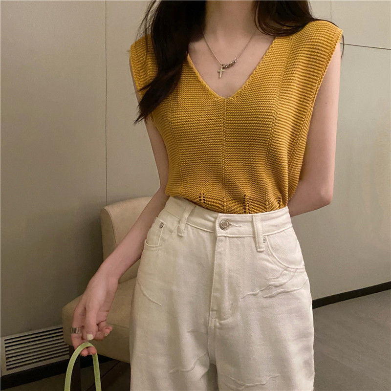 カップ付きインナー 新型 夏 女性 着痩せ ゆったり Vネック 透かし彫り ニット タンクトップ トップス キャミソール