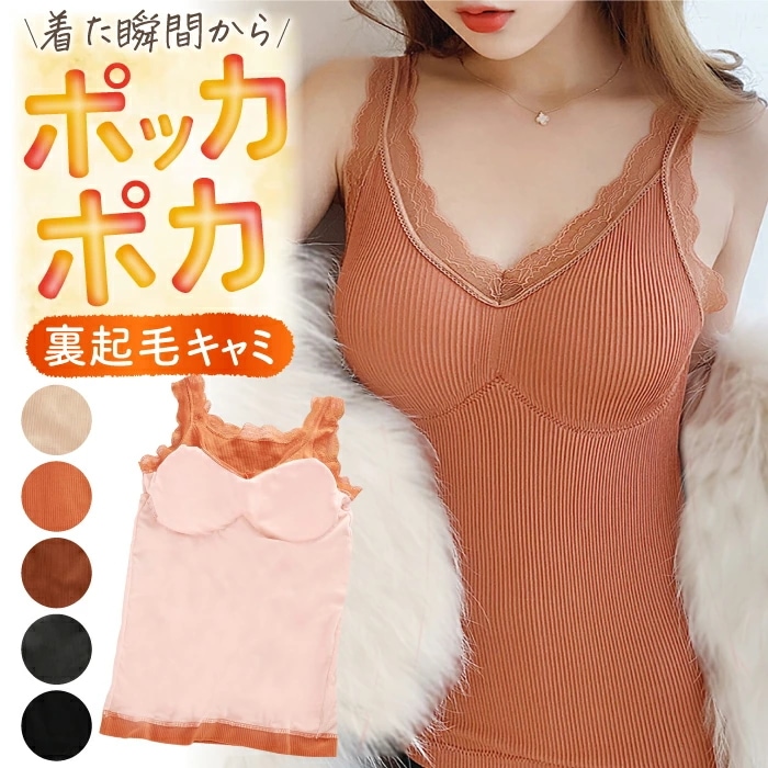 キャミソール 暖かい あったか インナー 裏起毛 温活 レース タンクトップ カップ付 ふわふわ 防寒 温活 冷え 秋 冬 重ね着 レース ナイトブラ カップ付 黒 ブラック ピンク