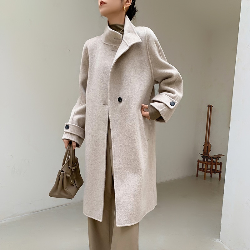 無地両面ツイードカシミヤコート女性秋冬新作ウール襟膝ルーズツイードジャケットロング部分 ファー 毛皮アウター
