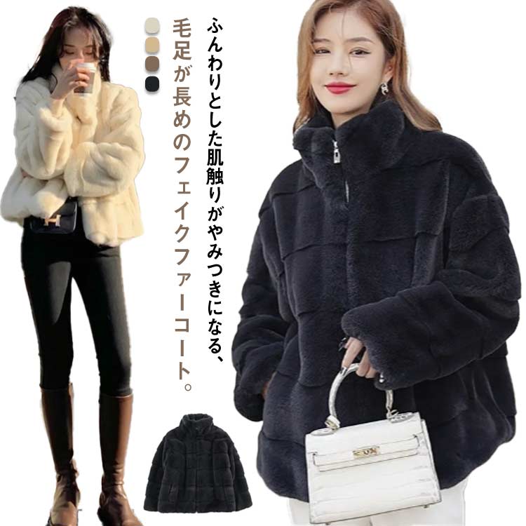 前開き ジャケット ファスナー ファーコート 長袖 エコファー 厚手 スタンドカラー 立ち襟 ポケット付き 無地 ふわふわ感 女性 もこもこアウター ボリュームフェイクファー 上着 防寒 おしゃれ 高