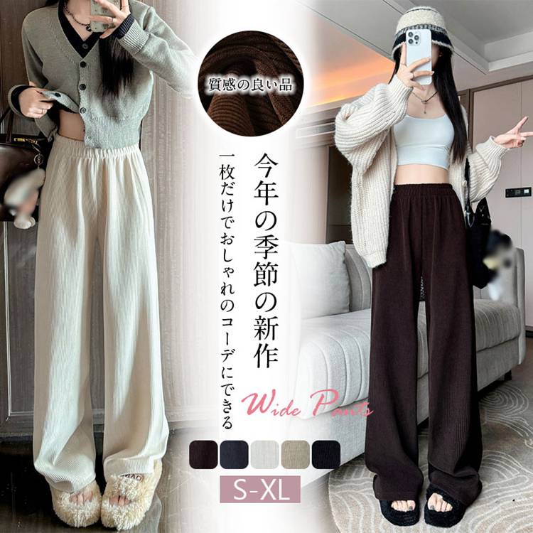 先着限定1980円/パンツ レディース 秋 リブ ワイドパンツ 縦ライン 高見え リブパンツ イージーパンツ ロング丈 シンプル 無地 楽ちん ズボン ウエストゴム 低身長 高身長 ゆったり 大きい