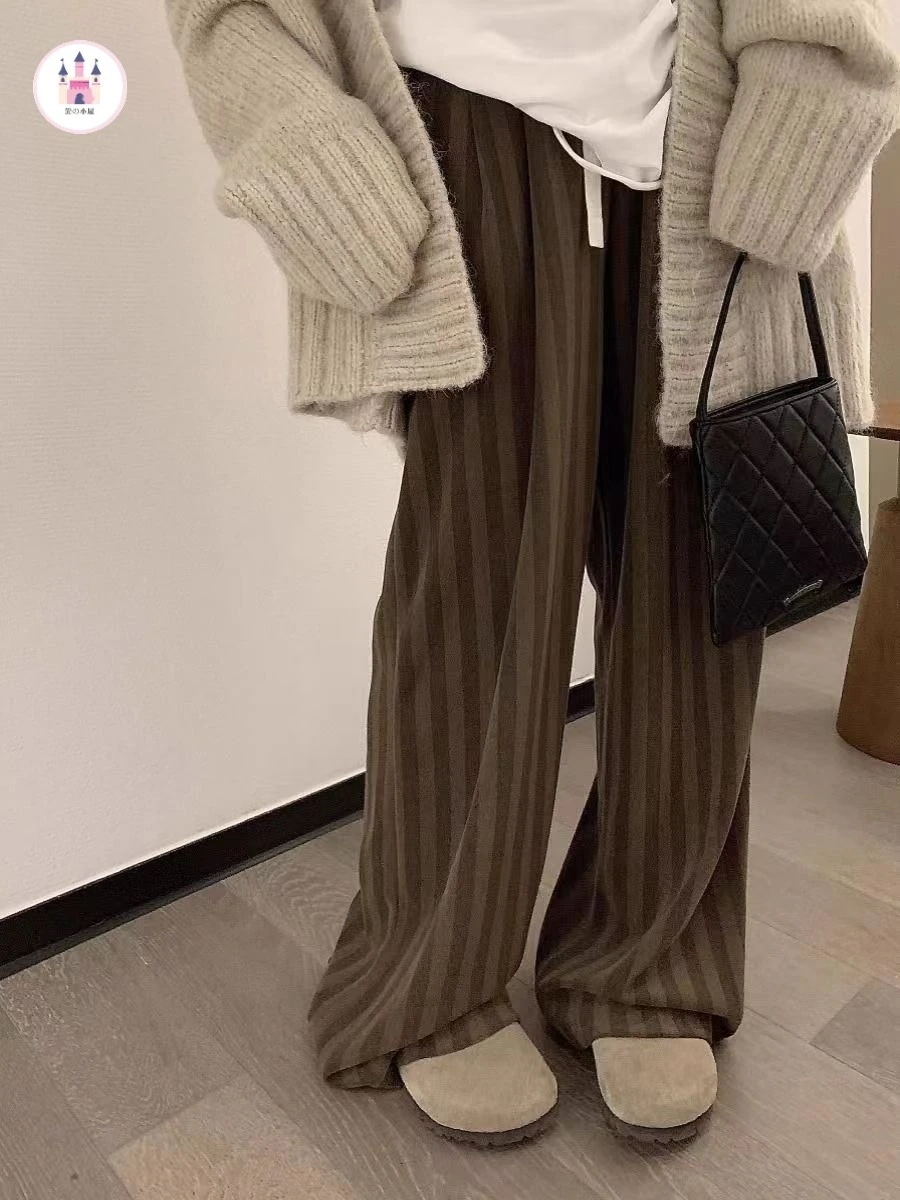 の新作韓国風モダン縦縞タオル地のスエード保温ルーズウエストワイドパンツオールインワンカジュアルパンツ女性 ロングパンツ