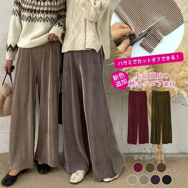 2024春秋楽ちんリラックスベロア上品素材厚めセルフカットプリーツパンツY19ワイドパンツ体型カバー ロングパンツ