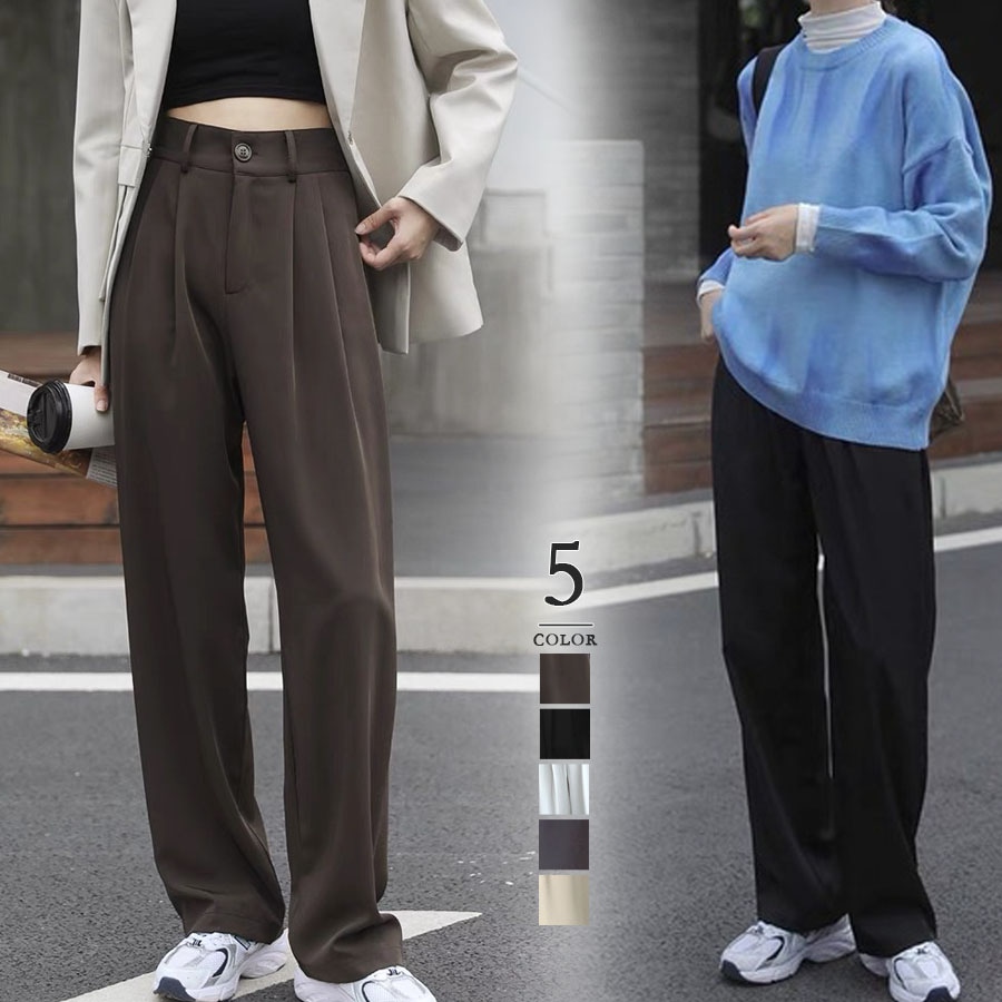2024レディースプレスセミワイドパンツ ハイウエストワンボタンピンタックスラックス韓国ファッション ロングパンツ
